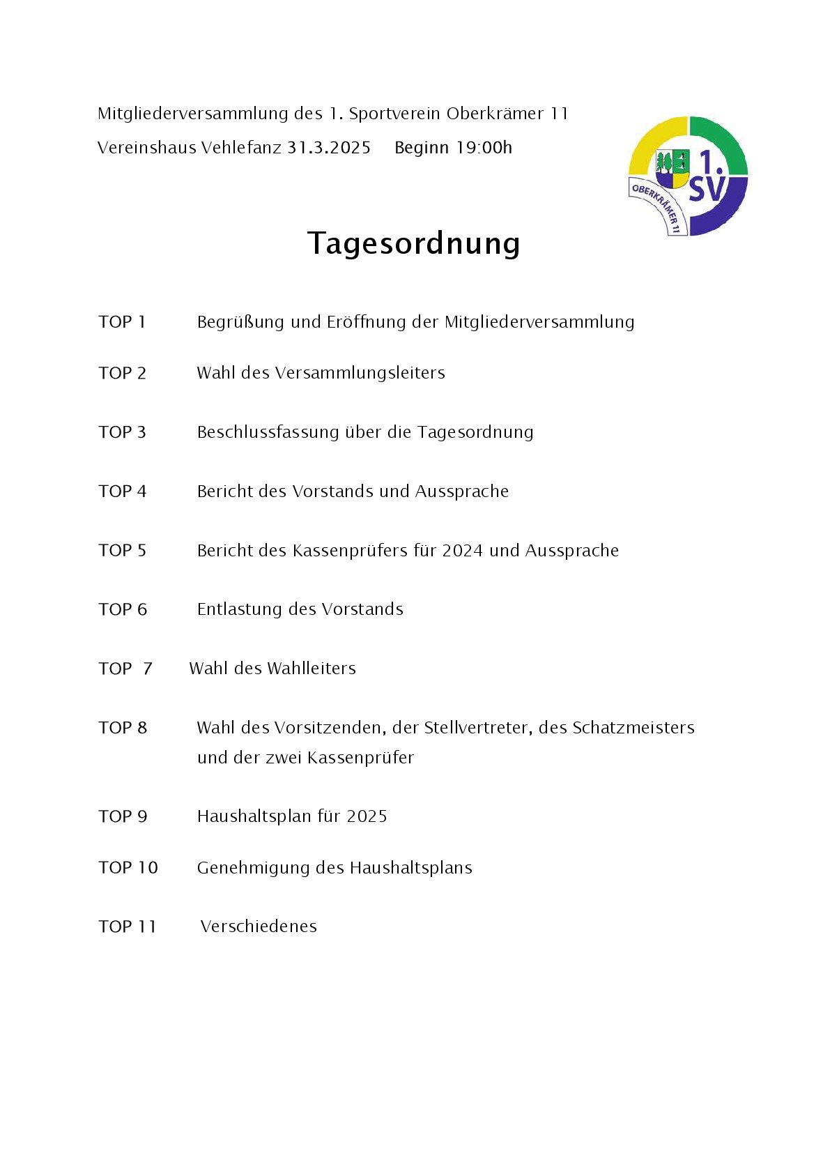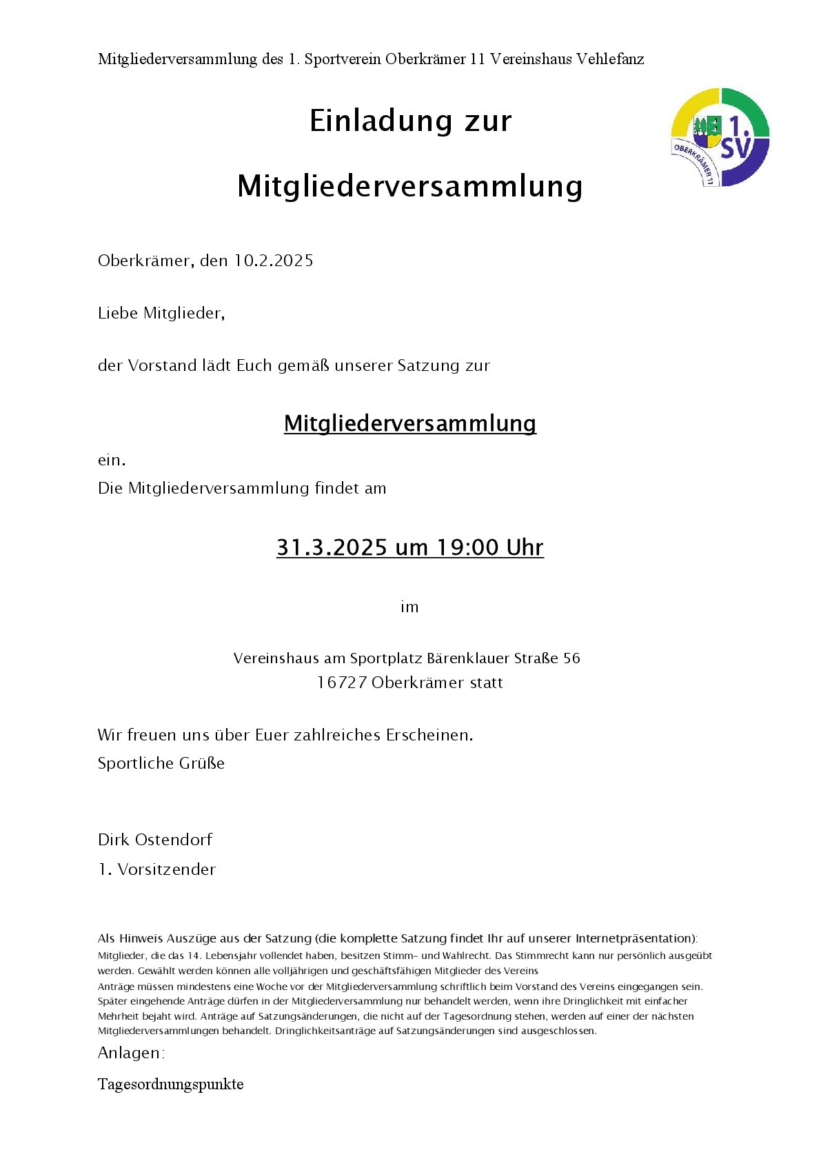 Der 1. SV Oberkrämer 11 lädt zur Mitgliederversammlung am 31.03.2025 ein.