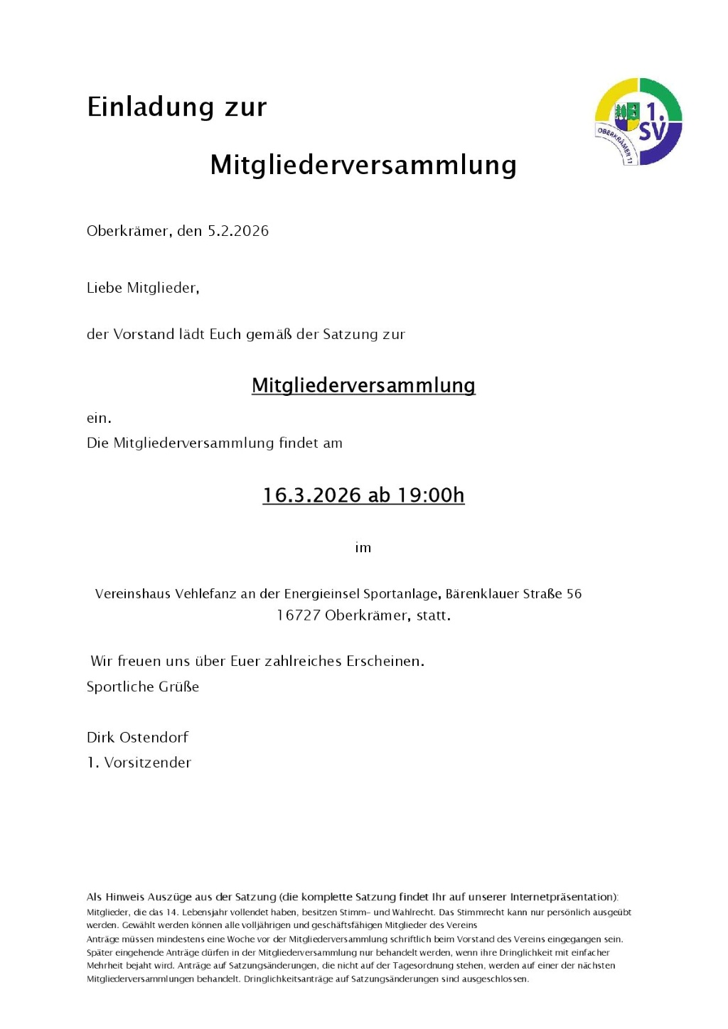 Der 1. SV Oberkrämer 11 lädt zur Mitgliederversammlung am 16.03.2025 ab 19:00 Uhr ein.