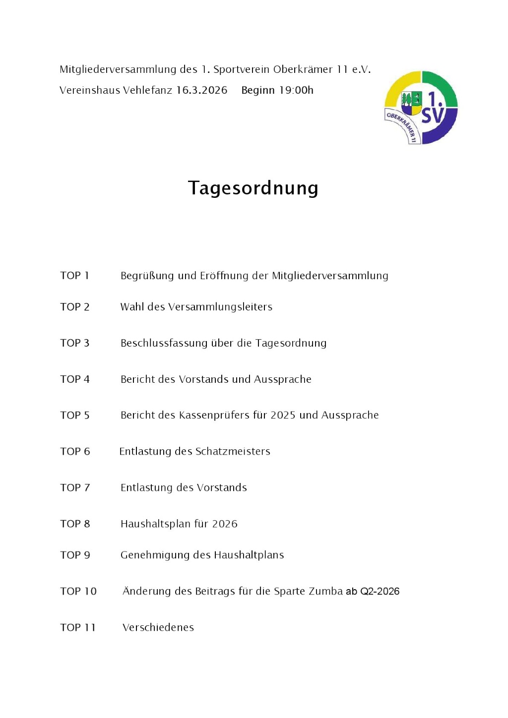 Der 1. SV Oberkrämer 11 lädt zur Mitgliederversammlung am 16.03.2025 ab 19:00 Uhr ein.